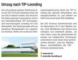 TAT-TECHNOM-Antriebstechnik GmbH ist demnächst im neuen Technologie- und Innovationspark (TIP) in Leonding zu finden Quelle: Mechatronik-Cluster; Online-Ausgabe, 26. November 2014 |